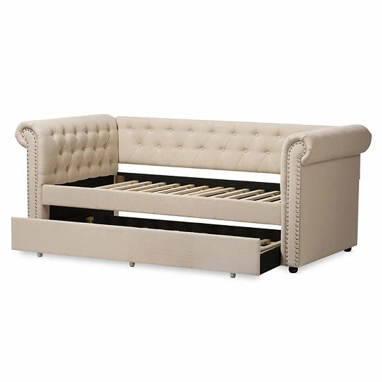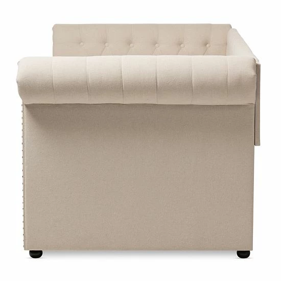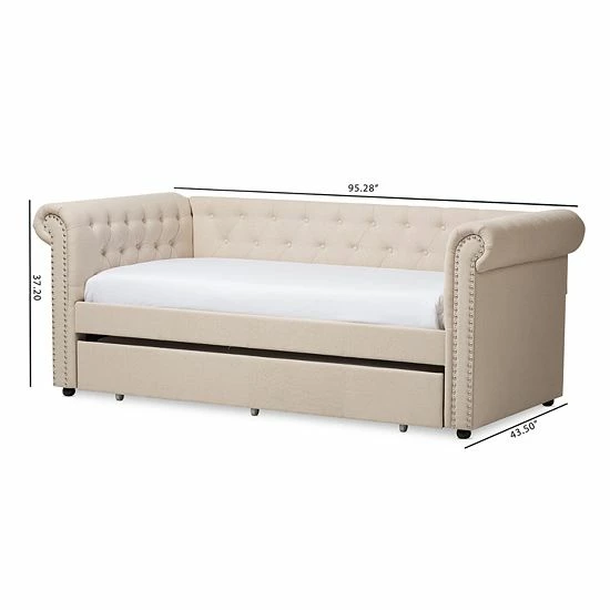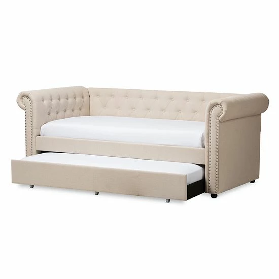 Featuring a roll-out trundle bed, this Baxton Studio Mabelle upholstered daybed adds extra sleeping space to any guest bedroom or family room.